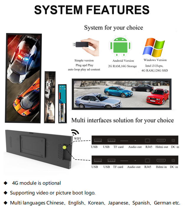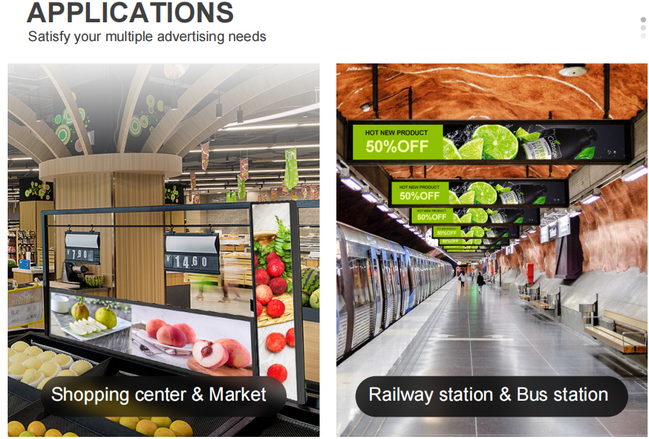 LCD bar screen is widely used in shopping malls, supermarkets, hospitals, schools, banks, hotels, airports and other places media display, advertising and touch inquiry.